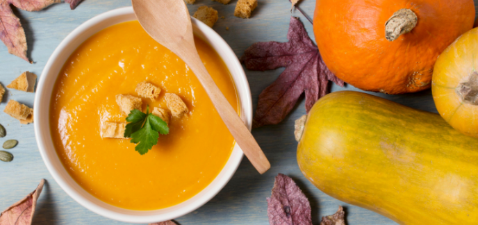 Een warme, fluweelzachte soep vol zoete en zachte herfstsmaken. Pompoen wordt gepureerd tot een romige textuur en vaak verrijkt met een vleugje kruiden zoals nootmuskaat of gember, waardoor een gezellig en verwarmend soepje ontstaat.