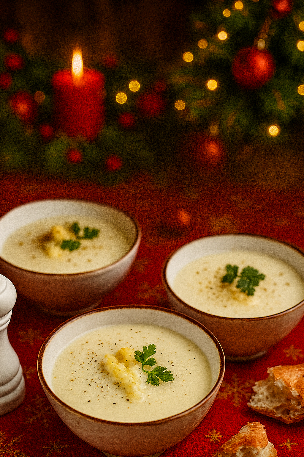 Voor de feestdagen werken we ze af met een subtiel vleugje room en kleine, sappige stukjes asperge voor een elegante bite. De smaak is puur, licht en toch rijk — een soep die meteen een vleugje verfijning op de feesttafel brengt.